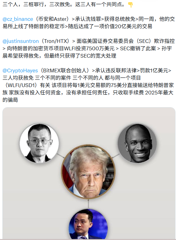 该网友指出,孙宇晨、赵长鹏、BitMax联合创始人Arthur Hayes这三位币圈大亨,都涉及洗钱或欺诈案件,但在向特朗普家族的加密货币进行巨额投资后,三人均获得了赦免。
