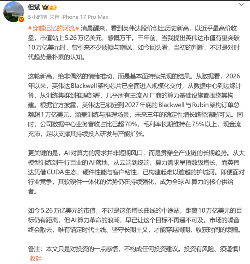北京时间周二清晨,,中国深圳东方港湾投资管理股份有限公司董事长但斌在微博上发表长文表示:“(英伟达)这轮新高,绝非偶然的情绪推动,而是基本面持续兑现的结果。”