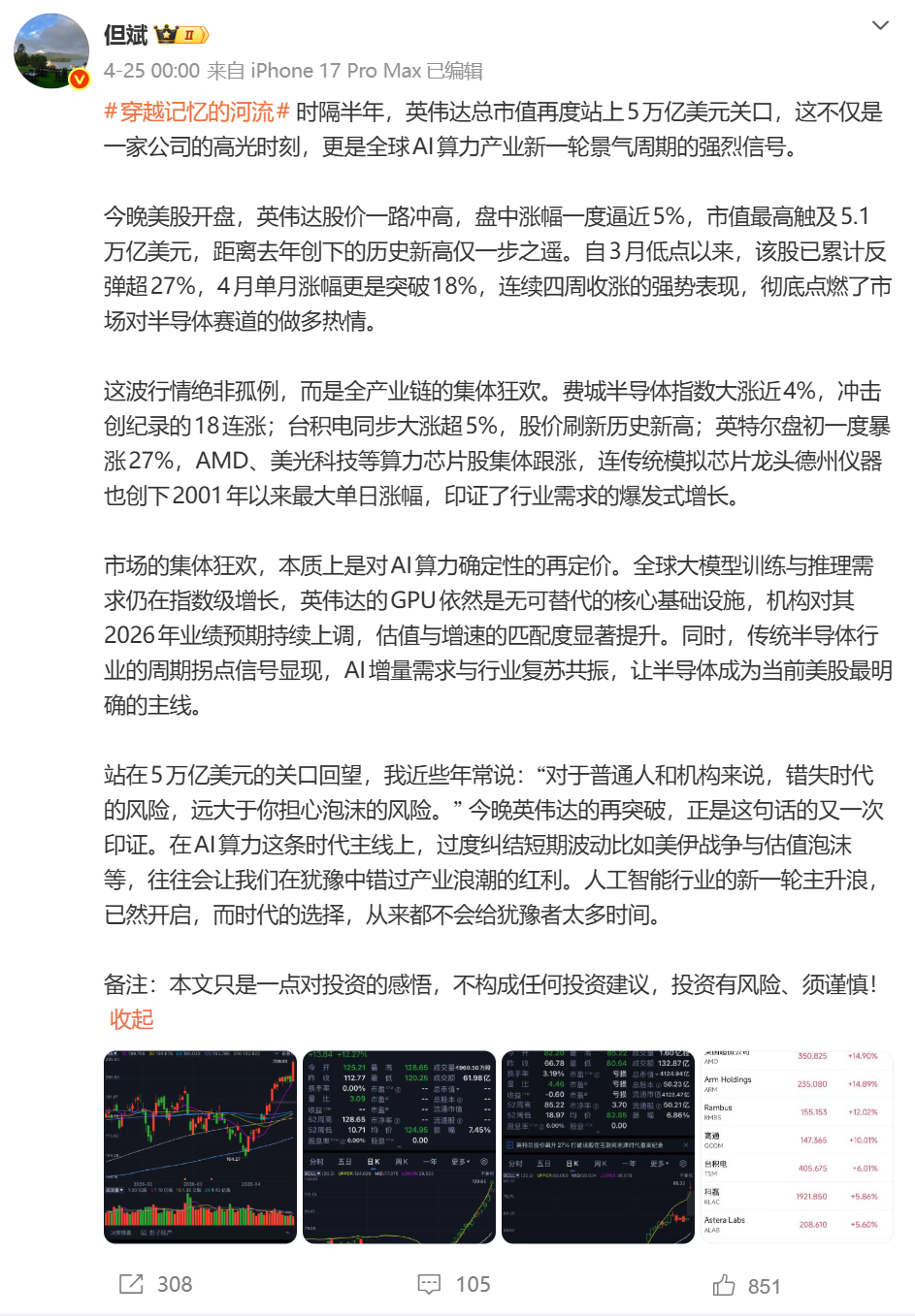 在帖子末尾,但斌感叹道:“我近些年常说:‘对于普通人和机构来说,错失时代的风险,远大于你担心泡沫的风险。’今晚英伟达的再突破,正是这句话的又一次印证。”