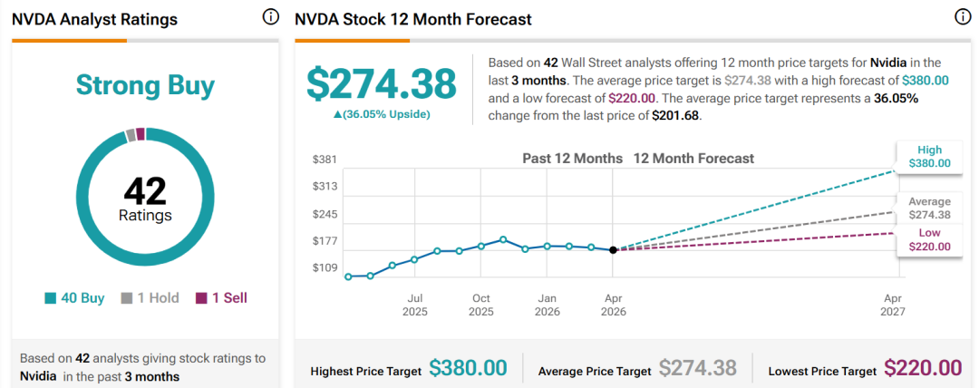 据tipranks网站统计,根据过去三个月内42位华尔街分析师对英伟达未来12个月的目标股价预测,平均目标价为274.38美元,最高预测为380.00美元,最低预测为220.00美元。平均目标价较最新股价216.61美元上涨27%。