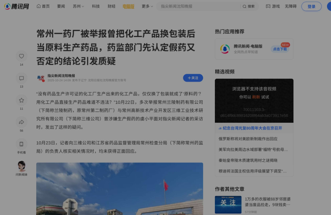根据该标题检索,这是由指尖新闻沈阳晚报在2025年10月刊发的一篇报道,报道中提及的两家涉事企业为常州兰陵制药有限公司(简称兰陵制药)和常州高新技术产业开发区三维工业技术研究所有限公司(简称三维公司)。