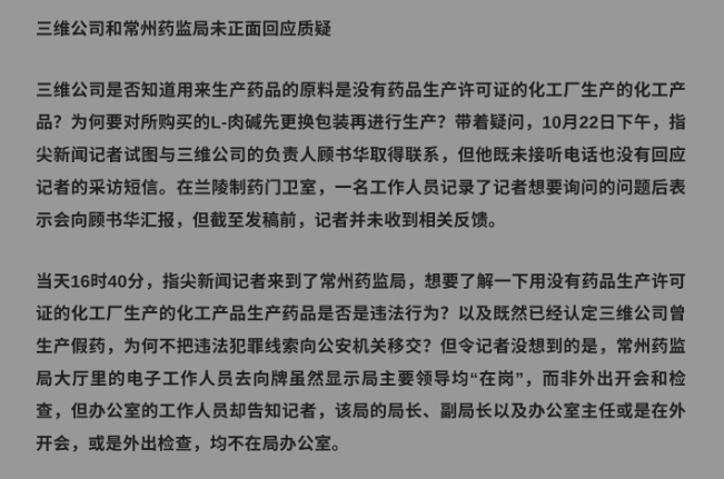 报道中,兰陵制药原法定代表人虞某平举报称,其所在药厂曾在1988年与三维公司签署协议,约定共同生产左卡尼汀注射液等相关药品。而他经过调查发现,兰陵制药并未按照国家药监局审批的“六步法”制成原料药左卡尼汀,而是从浙江一家没有药品生产资质的化工厂购买化工产品直接更换包装和标签冒充原料药左卡尼汀,生产左卡尼汀注射液。为避免自己卷入到生产假药的违法犯罪中,虞某平提前终止了兰陵制药与三维公司的合作,并在此后举报三维公司涉嫌用非药化工产品生产“假药”。