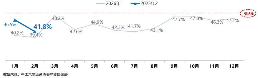 中国汽车流通协会二手车经理人指数显示,2026年2月二手车经理人指数为41.8%,已连续至少14个月处于荣枯线以下,这代表着二手车市场的持续不景气。