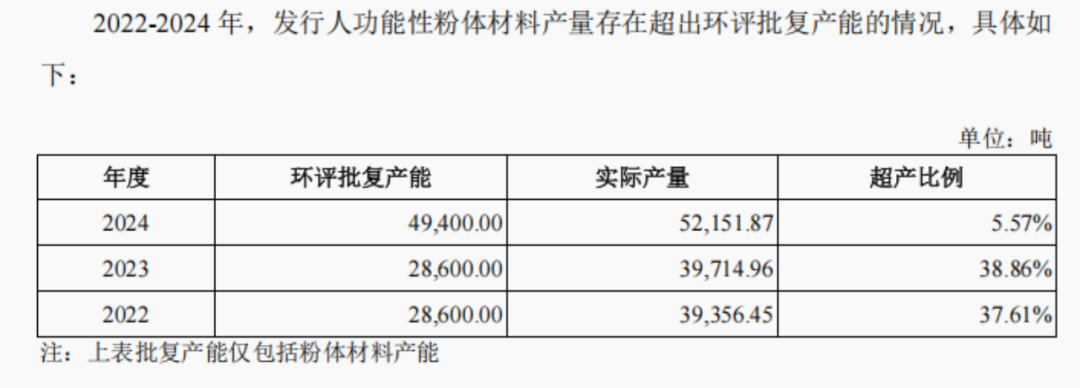 除此之外,公司的另外两大产品阻燃粉体材料、吸波粉体材料销售单价同样走低,吸波粉体销售单价从3.48万元/吨降至2.13万元/吨,降幅近40%。《招股书》测算显示,若其他条件不变,主要产品单位售价下降5%,三年营收将分别减少1922.96万元、2337.46万元、2668.24万元,可见价格波动对业绩冲击显著。售价下行叠加原材料涨价,金戈新材综合毛利率从2023年25.28%降至2025年22.36%,连续三年下滑。价格的下跌也确实带来了销量的增长,但这也导致金戈新材的产量存在超出环评批复产能的情况。2022-2024年,金戈新材超产比例达到37.61%、38.86%、5.57%。直到IPO前的2025年,产能利用率才降至94.96%并完成整改。