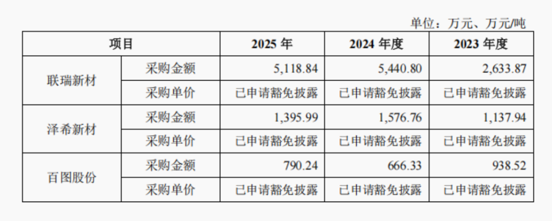 其中,百图股份在2022年系公司第二大供应商,但2023年起又退出前五大供应商之列。联瑞新材在2023-2025年,不仅是公司的第二大供应商,同时还是公司球形氧化铝原料第一大供应商,该原料各期采购金额分别为2633.87万元、5440.8万元、5118.84万元,呈逐年增长趋势。对于金戈新材向联瑞新材及其他供应商的采购单价,在《问询回复函》中,公司“已申请豁免披露”,因此对于其具体价格,我们不得而知。不过,可以知道的是,公司对联瑞新材的各期采购单价持续下降,且低于其他同类供应商。这引发了北交所的关注,并在问询中直指采购价格公允性、是否存在利益输送等。