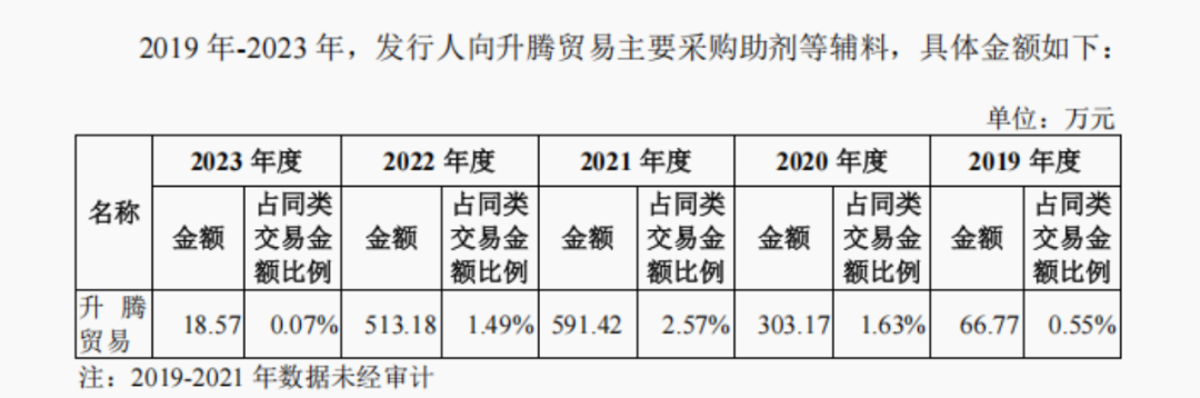 更值得关注的是,在公司冲刺IPO前夕,多家关联方“集体”注销。比如实际控制人黄超亮的侄子黄亦聪及侄子配偶李丹红控制的广州升腾贸易有限公司(以下简称“升腾贸易”)、广州仟腾贸易有限公司;董事、副总经理刘振的妹妹的配偶隆之杰曾控制的企业常熟市佳锦纺织品有限公司;董事周颂淦报告期内曾经营的个体工商户佛山市禅城区隽悦乐电子商务服务部。这些企业分别于2024年4月、2022年2月、2025年1月、2024年11月注销,注销时间较为集中。其中,升腾贸易是金戈新材的“专属”供应商,其客户只有金戈新材,2019年10月与公司开始合作,2023年3月终止合作。金戈新材主要向升腾贸易采购助剂等辅料,2019-2023年,采购金额为66.77万元、303.17万元、591.42万元、513.18万元、18.57万元。