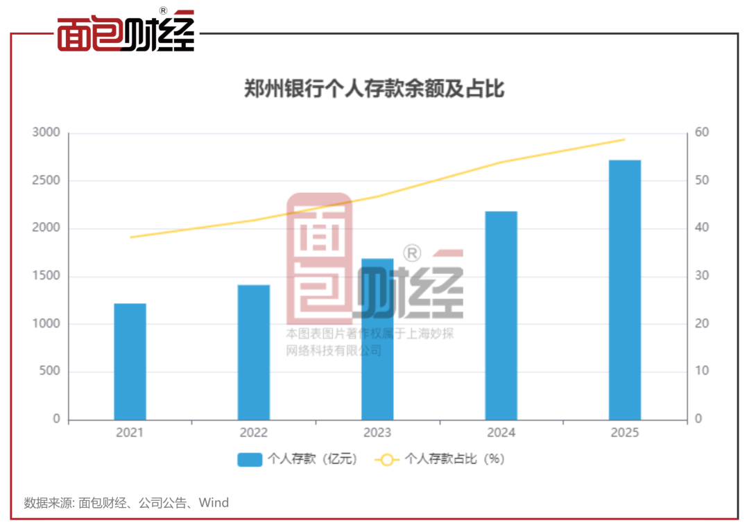 郑州银行来自个人存款的金额和占比持续上升。截至2025年末,公司个人存款余额占全行存款总额的比重上升至58.7%,同比上升4.77个百分点。