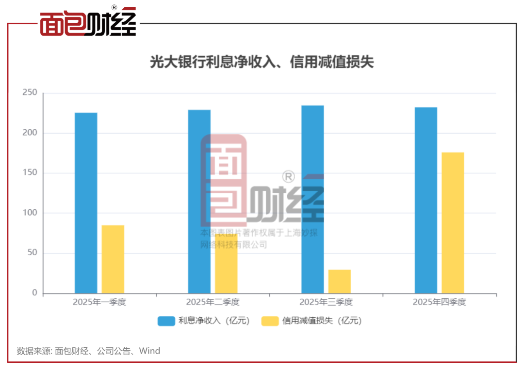 2025年四季度,光大银行利息净收入依然维持在200多亿的水平,说明放贷赚钱的能力没丢。但转头一看,信用减值损失竟高达175.88亿,几乎是三季度(29.36亿)的6倍,占全年计提总额将近一半。这笔巨额的“风险准备金”像一头巨兽,一口吞掉了本该属于股东的大部分利润,导致净利从百亿元级别瞬间“腰斩”再“膝斩”,仅剩18亿。