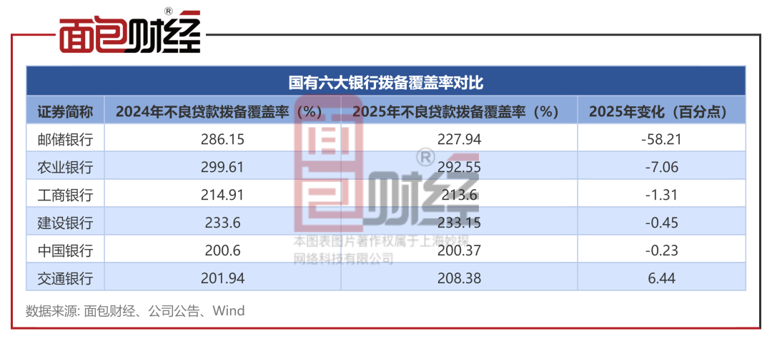 值得注意的是,邮储银行在业绩增速放缓的同时,其风险缓冲垫——“拨备覆盖率”也出现了显著收缩。该指标在2025年下降超过58个百分点,降幅明显高于其他国有大行。尽管下降后,邮储银行的拨备覆盖率仍相对较高。