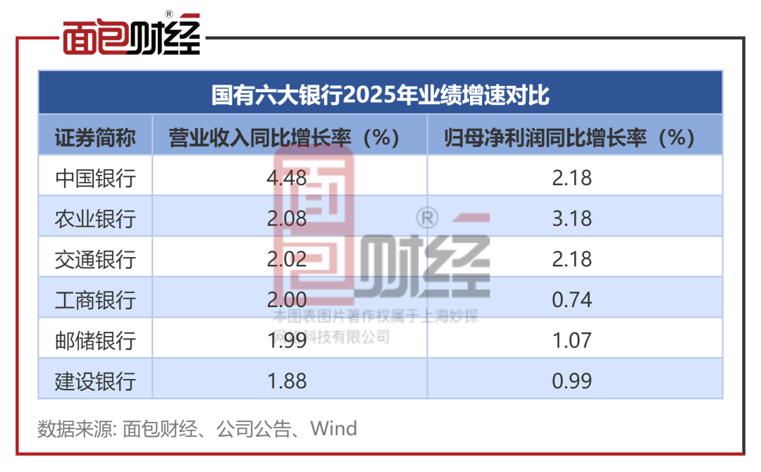 数据显示,2025年国有六大行归母净利润均实现正增长,但增速分化明显:农业银行以3.18% 的增速领跑;中国银行和交通银行增速均为2.18%;邮储银行增速为1.07%。