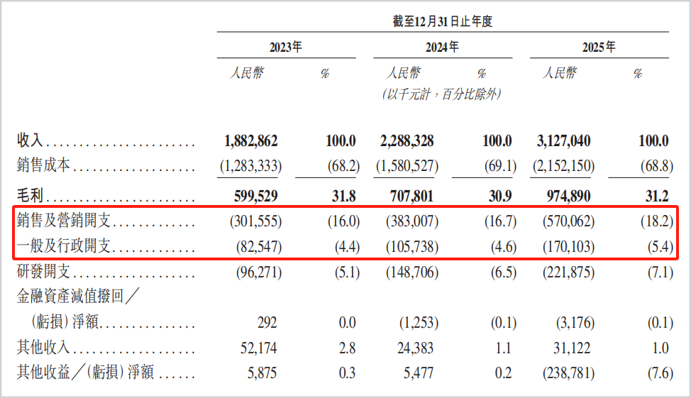 近年来,创想三维的费用开支对盈利的挤压越发明显,占大头的营销开支由2023年的3.01亿增加到2025年的5.7亿,占营收比重从16%提升至18.2%。