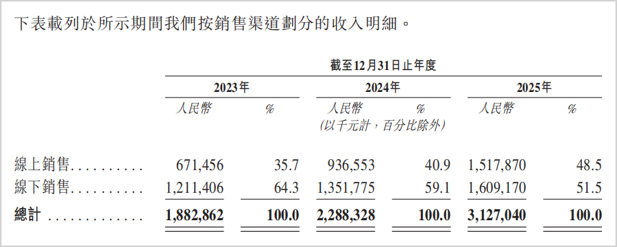 2023年至2025年,创想三维的线上渠道收入由6.71亿增长到15.18亿,规模已经翻倍,收入占比由35.7%提升到48.5%,线下收入则由12.11亿增长到16.09亿,增速显然不及线上。
