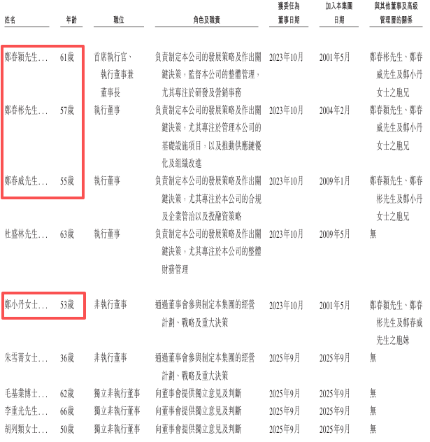61岁的郑春颖担任董事长兼CEO,其2名弟弟和1位妹妹均是董事会成员。