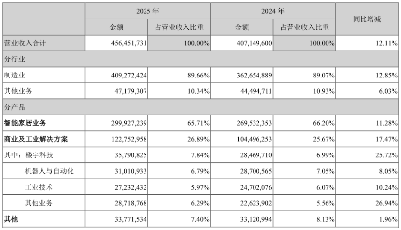 2021年开始,美的集团将主营业务重新划分为智能家居事业群、工业技术事业群、楼宇科技事业部、机器人与自动化事业部及数字化创新业务等五大业务板块。其中,智能家居事业群整合了集团所有面向消费者业务(To C业务),产品线包括家用空调、冰箱、洗衣机等白电产品,还包括厨卫大电(包括洗碗机、嵌入式微蒸烤、吸油烟机、煤气灶等)、小家电及清洁电器。2025年全年,智能家居在美的集团的营收占比为65.71%,属于美的的基本盘业务。