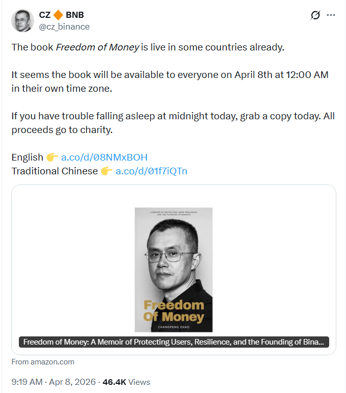 4月8日凌晨零点,赵长鹏长达457页的回忆录《金钱自由》(Freedom of Money,繁体中文版书名《币安人生》)正式开启预售。