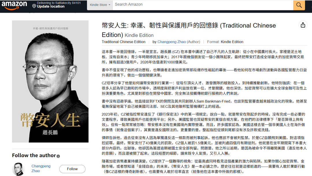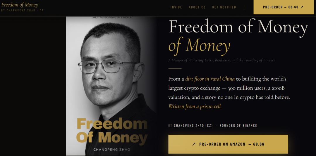 为了推广此回忆录,赵长鹏不仅在X上宣传,更是专门建立了一个网站售卖,预购价每本8.66欧元或9.99美元,点击预购即跳转到亚马逊网页,可提供Kindle推送。