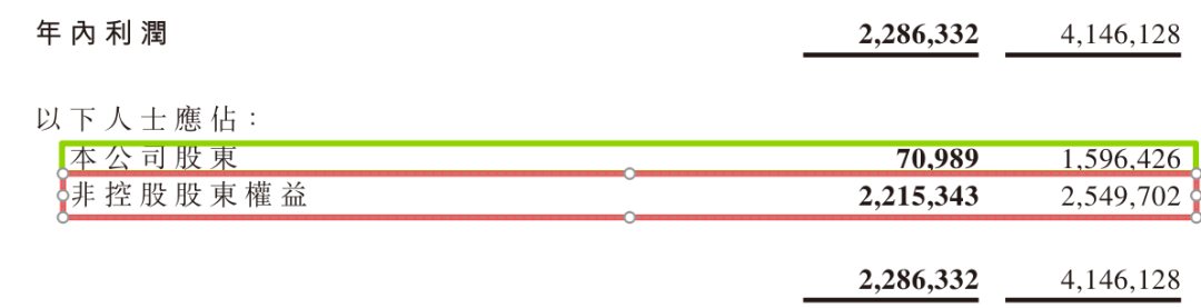 值得注意的是,归母净利润占公司年内利润的比例仅为3.10%,非控股股东权益所占比例高达96.90%。