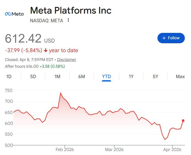 Meta股价盘中上涨超过9%,收盘大涨6.5%,报612.42美元/股,总市值1.55万亿美元。不过,Meta股价年内仍然下跌近6%。