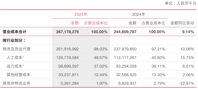 不过,考虑到日益增长的人工成本压力,顺丰控股毛利率的未来走势仍不明朗。财报数据显示,2025年全年,顺丰总营业成本达2671.8亿元,同比增长9.14%。