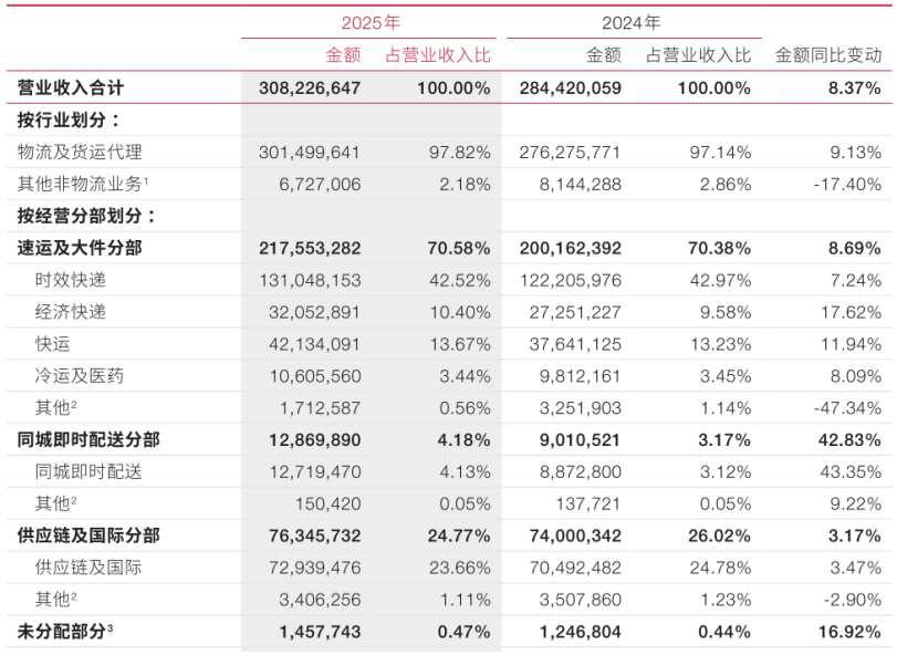 财报显示,2025年全年,顺丰速运及大件分部实现营收2175.5亿元,同比增长8.69%,营收占比为70.38%。其中,经济快递和快运业务均实现了同比双位数的增长。净利润方面,顺丰速运及大件分部实现净利润约为106.0亿元,同比下降3.46%,主要受市场拓展费用投入增加以及长期战略性投入所影响。