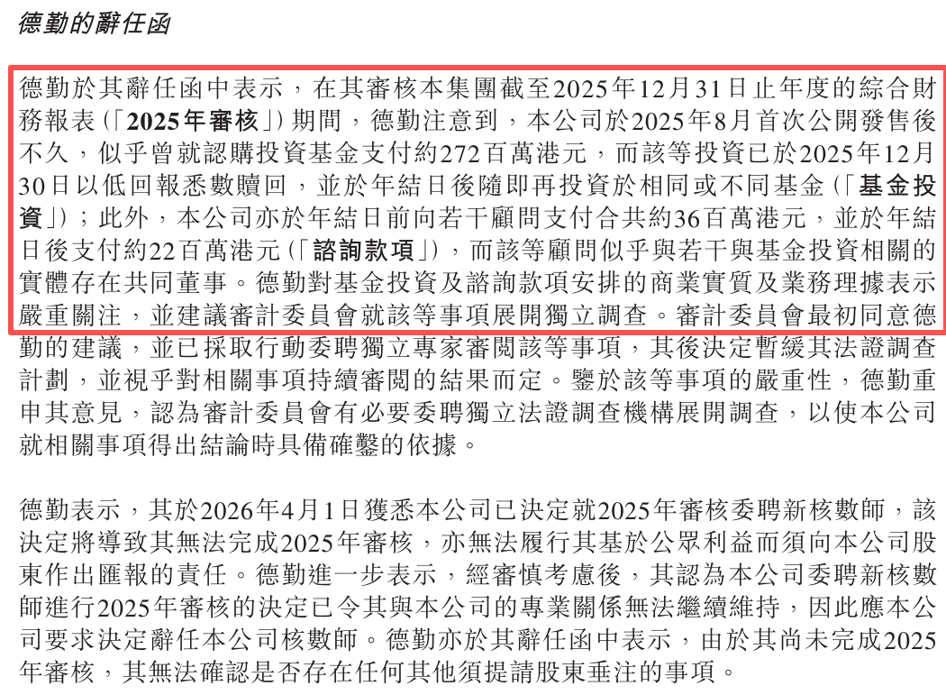 在审核中慧生物2025年度综合财务报表期间,德勤注意到,该公司于2025年8月IPO后不久,似乎曾就认购投资基金支付约2.72亿港元。