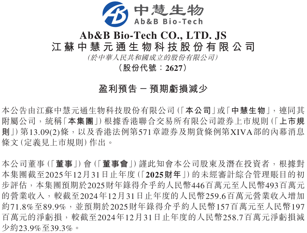 2月26日晚间,中慧生物发布盈利预告,称公司预计2025年营收4.46亿元至4.93亿元,同比增长约71.8%至89.9%。