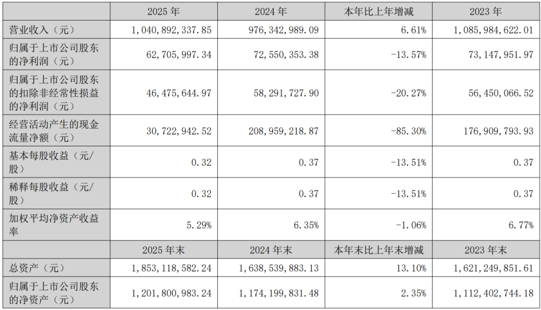 2025年年报显示,公司全年营收10.41亿元,同比微增6.61%;归母净利润6270.60万元,同比下滑13.57%。扣非净利润仅4647.56万元,降幅更是扩大到20.27%。