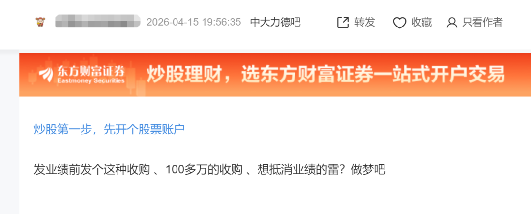 股民的评论一针见血:“发业绩前发个这种收购,100多万的收购,想抵消业绩的雷?做梦吧。”