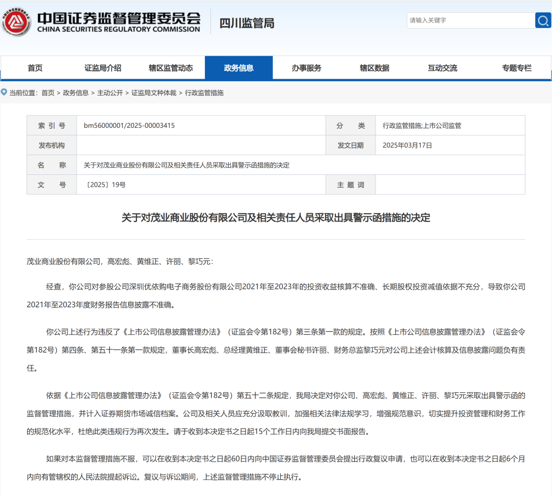 更值得警惕的是合规风险的爆发。2026年1月,四川证监局向茂业商业下发警示函,直指公司2021-2023年存在投资收益核算不准确、长期股权投资减值依据不足等问题,导致财务报告披露不实,公司董事长、总经理、财务总监等核心管理层均被点名批评。