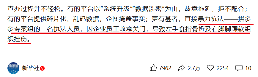 当时新华社的一篇文章就直接指出:拼多多暴力抗法,企业员工故意关门导致一名执法人员左手食指骨折及右脚脚踝软组织挫伤。