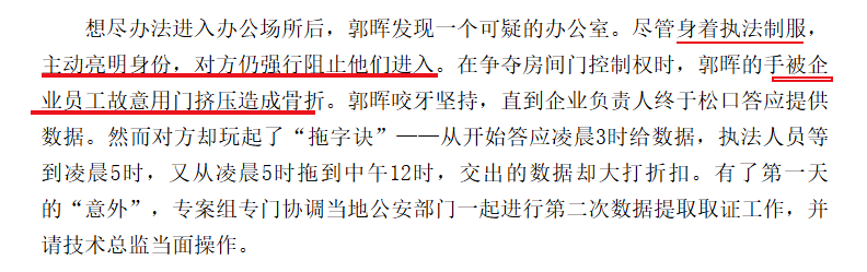在执法人员身着制服、主动亮明身份后,企业员工依旧强行阻止他们进入。在争夺房间门控制权时,执法人员的手被企业员工故意用门挤压造成骨折。