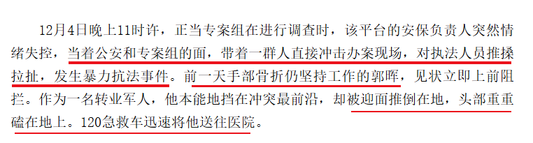 专案组在进行调查时,该平台的安保负责人突然情绪失控,当着公安和专案组的面,带着一群人直接冲进办案现场,对执法人员推搡拉扯。而倒霉的还是前一天刚被该企业员工用门把手夹骨折的执法人员,他上前阻拦,结果却被推倒在地,头部重磕在地上,被120送进医院。