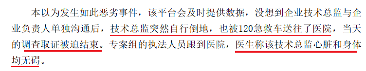不知道这是不是给了该平台工作人员灵感,该平台技术总监与企业负责人单独沟通后,技术总监突然自行倒地,也被120急救车送进了医院,调查确证也被迫结束。事后,执法人员跟到医院,医生说,该技术总监心脏和身体均无碍。