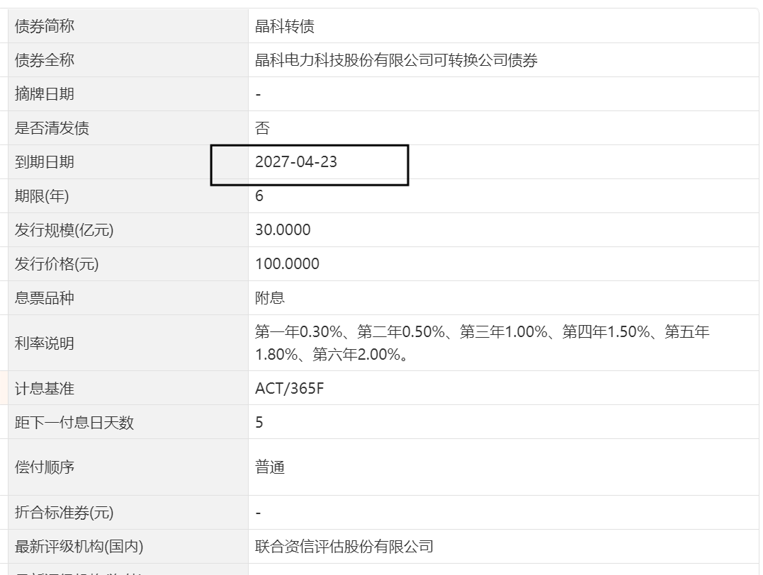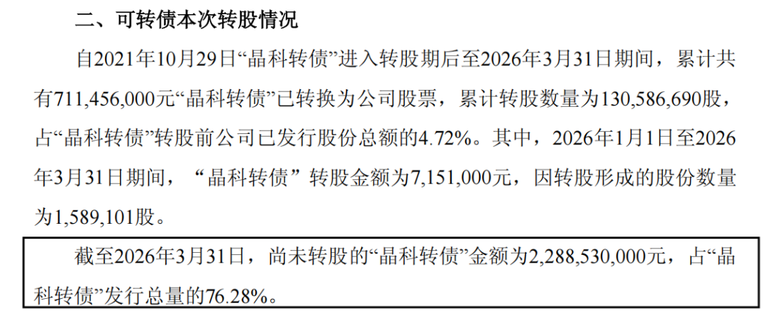 晶科科技这笔可转债总规模30亿元,明年4月到期。截至2026年3月31日,尚未转股金额仍有22.9亿元,未转股比例超过四分之三。