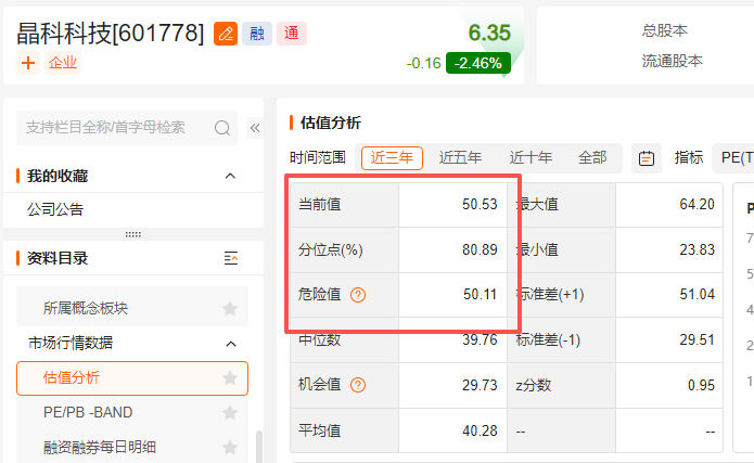 纵向看,晶科科技当前的市盈率TTM已经来到2025年后的高区间,甚至触及Choice金融终端的危险值提醒;