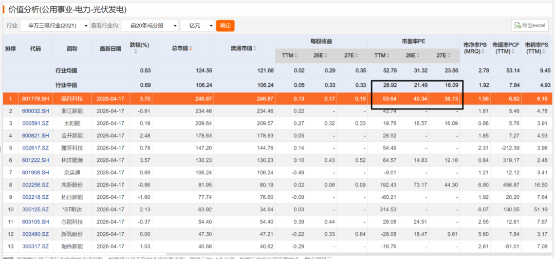 横向看,在申万三级行业光伏发电板块里,公司53.64倍的市盈率,也明显高于板块中位数28.92倍。动态市盈率方面,基于2026年和2027年预测利润计算,公司对应动态市盈率分别为40.34倍和36.13倍,而板块中位数仅为21.49倍和16.09倍。