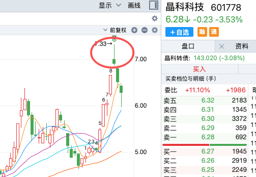 而在随后的首个交易日,晶科科技盘中一度涨停,但随后迅速回落,技术形态上留下了明显的长上影线,形成了股民熟悉的“吊颈线”,随后两个交易日股价连阴下挫。