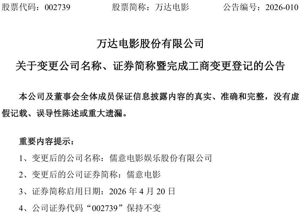 值得注意的是,公司证券简称也自2026年4月20日起由“万达电影”变更为“儒意电影”。