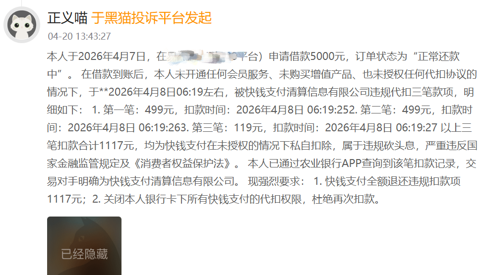 该消费者称,“在借款到账后,本人未开通任何会员服务、未购买增值产品、也未授权任何代扣协议的情况下”,于4月8日06:19左右被快钱支付违规代扣三笔款项,合计1117元。
