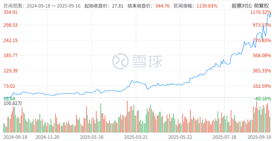 2025年9月16日,胜宏科技录得上市以来最高收盘价344.76元,使其近一年股价涨幅高达1139.83%,妥妥的11倍大牛股。