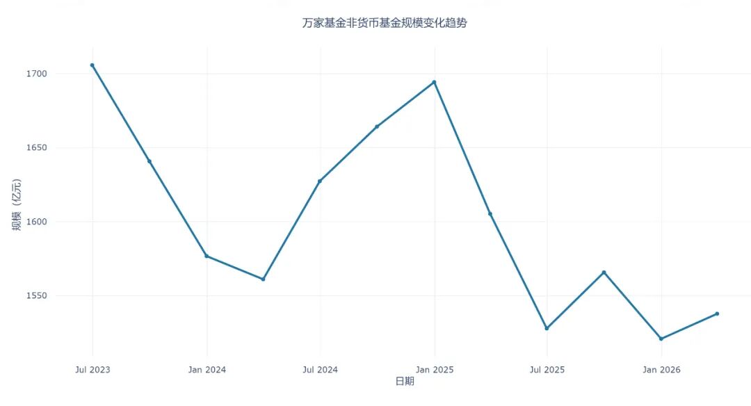在货币基金成为规模增长的动力的同时,万家基金的非货币基金规模却增长停滞,甚至出现下滑的情况。根据wind数据统计,从2023年3月31日末至2026年3月31日末,近3年来,万家基金的非货币基金规模波动较大,整体呈现下降的趋势,规模从1797.26亿元下滑至1537.76亿元,下降了14.44%。
