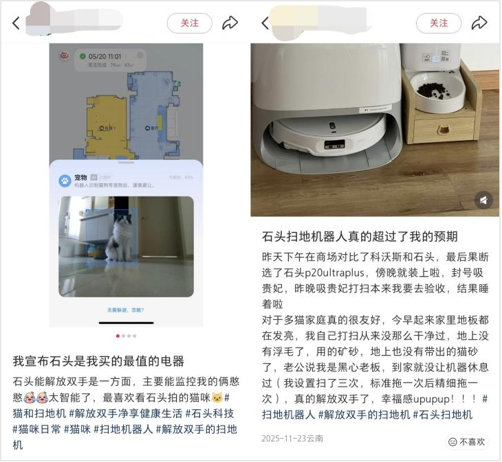 社交平台上,多猫家庭惊喜于石头扫地机让“地板没了猫砂和浮毛,干净到发亮”;靠石头解放双手、监控猫咪的铲屎官则高兴宣布“石头是我买的最值的电器”;还有人称,“家里3猫1狗,全靠石头续命。”