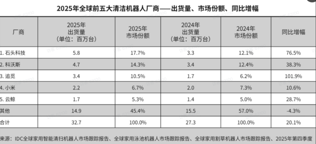 据国际数据公司IDC监测数据显示,2025年,智能扫地机器人全球市场品牌集中度继续保持较高水平,TOP5品牌占比已超70.4%。总体来看,头部品牌集中度还在提升,行业马太效应愈发明显。
