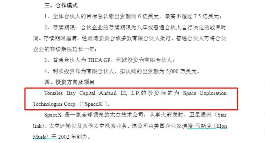 简单来说,利欧股份的投资,相当于只是参与了标的为Space X的投资基金的投资项目。并不能参与Space X 的火箭发射或研制生产销售,以及公司相关的其他太空探索项目。