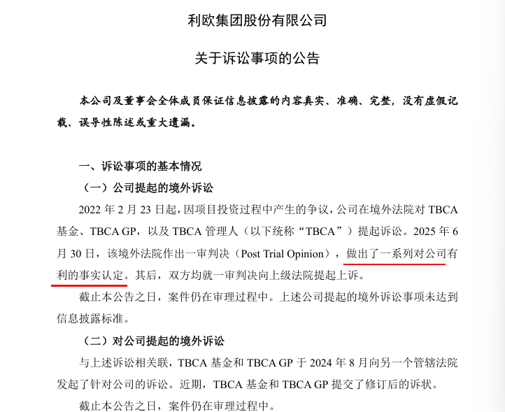 今年1月,网上突然传出消息称,美国法院已做出终审判决,认定利欧股份子公司的LP份额合法有效,TBCA单方面退款属于违约行为,判决其需恢复利欧股份的LP身份并承担相关责任。但很快利欧股份便澄清无重大未披露事项。