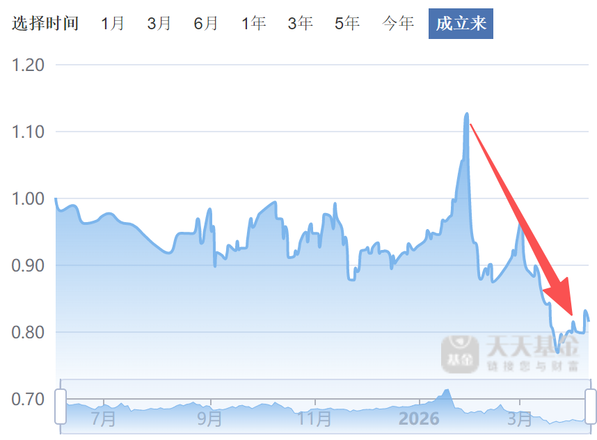 去年成立后一直半死不活地盘整,年末突然冲高一波,净值摸到1.13。基民以为终于要起飞了,结果刚抬头就被一记闷棍打回原形。