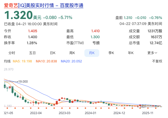 2026年3月30日,爱奇艺以保密形式向港交所递交上市申请。该公司在美股市场的表现处于历史低位:2018年上市时发行价18美元,市值一度超过310亿美元;截至2026年4月22日,股价约1.32美元/股,市值约12.74亿美元,较峰值蒸发300亿美元,折合人民币2047亿元。